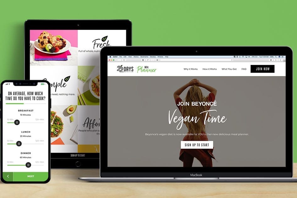 In 2015, Beyoncé announced a partnership with her personal trainer, Marco Borges, that resulted in the launch of a vegan meal delivery service. 22 Days Nutrition was strategically named after the notion that it takes 21 days to curb a bad habit and adopt a new one. The partnership also saw the subsequent creation of a meal planner, which offers customized recipes to members. As part of the service, customers receive recipes, grocery lists and on-demand help from food coaches for $39/quarter of $99/year.