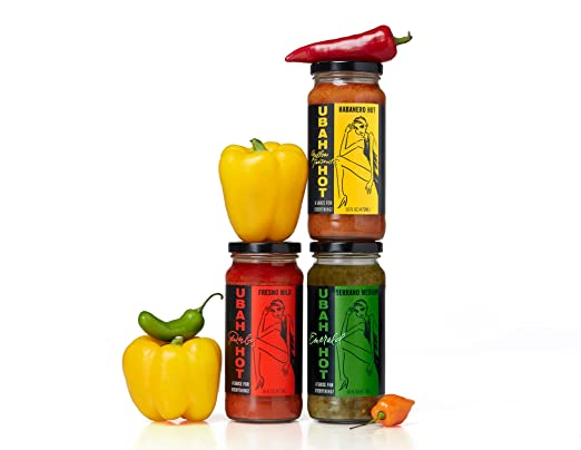 Ubah Hot is a hot sauce that can be used to make any meal delicious. It adds flavor and brings a sensational taste of Africa to the palate. The UBAH HOT Hot Sauce collection comes with all three varieties — ruby for fresno mild, emerald for serrano medium, and yellow tanzanite for habanero hot. The fresno mild has a mild taste and vibrant red color perfect to enjoy on chips, bread, and more.