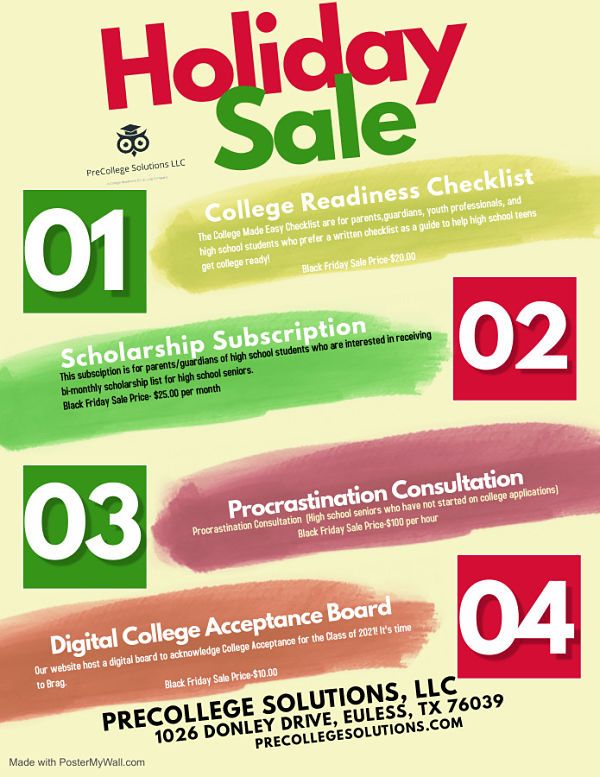 Do you know someone who is looking to further their education? Give the gift of preparedness. PreCollege Solutions is a college readiness consulting company that specializes in college admissions and scholarship assistance. They have a series of holiday specials on Scholarship Subscription, College Readiness Checklists, and more.