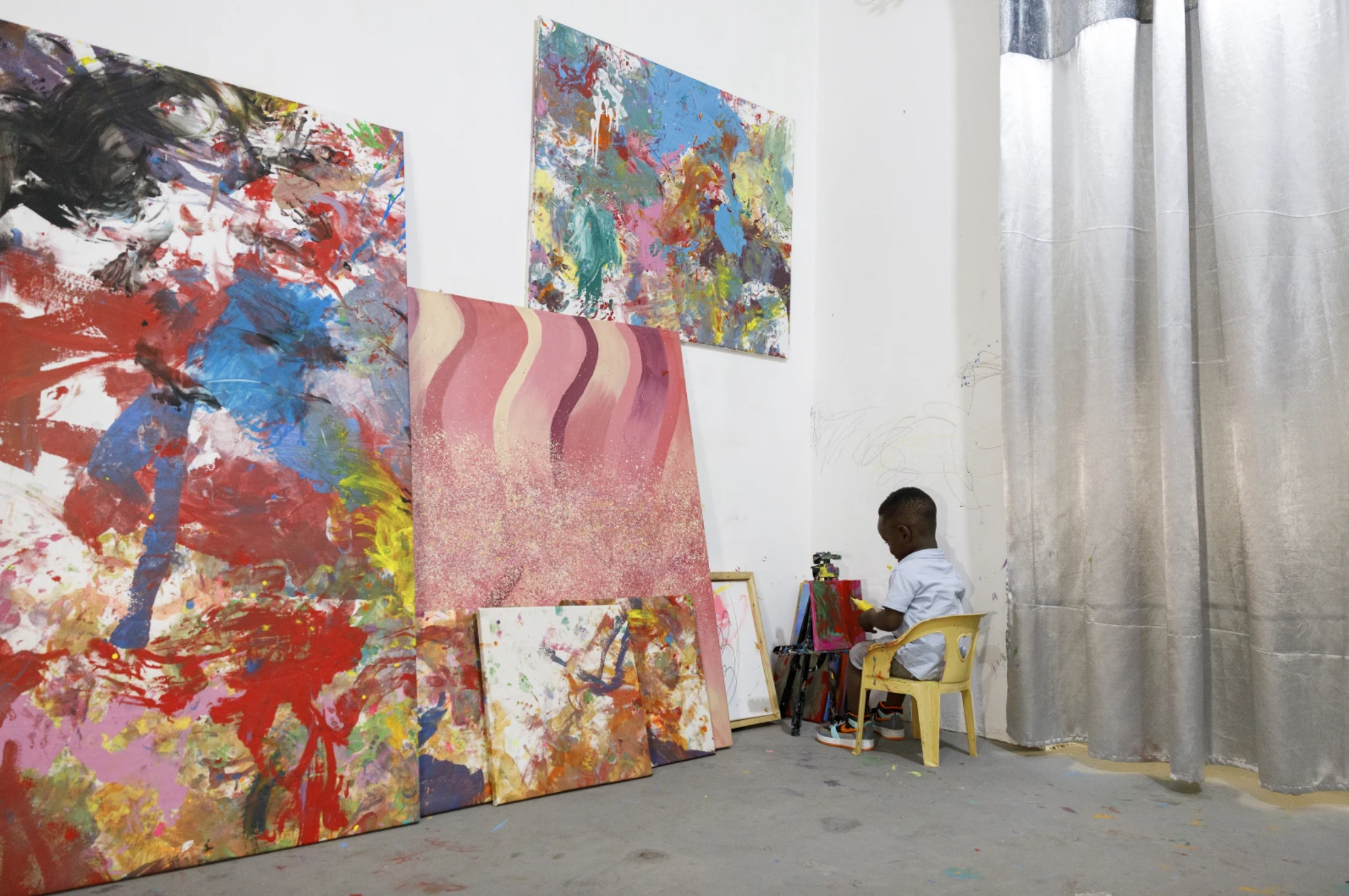 Ace-Liam’s journey into the art world began serendipitously. At just six months old, while other infants were just beginning to explore their surroundings, Ace-Liam was already showing a keen interest in colors and paints. His mother, Chantelle Kuukua Eghan, a seasoned artist and founder of Arts and Cocktails Studio in Accra, Ghana, noticed his fascination. In an effort to keep him engaged while she worked on her own paintings, she spread out a canvas on the floor and added some paint. What ensued was a delightful mess of colors as Ace-Liam crawled across the canvas, creating his first masterpiece aptly titled “The Crawl.”