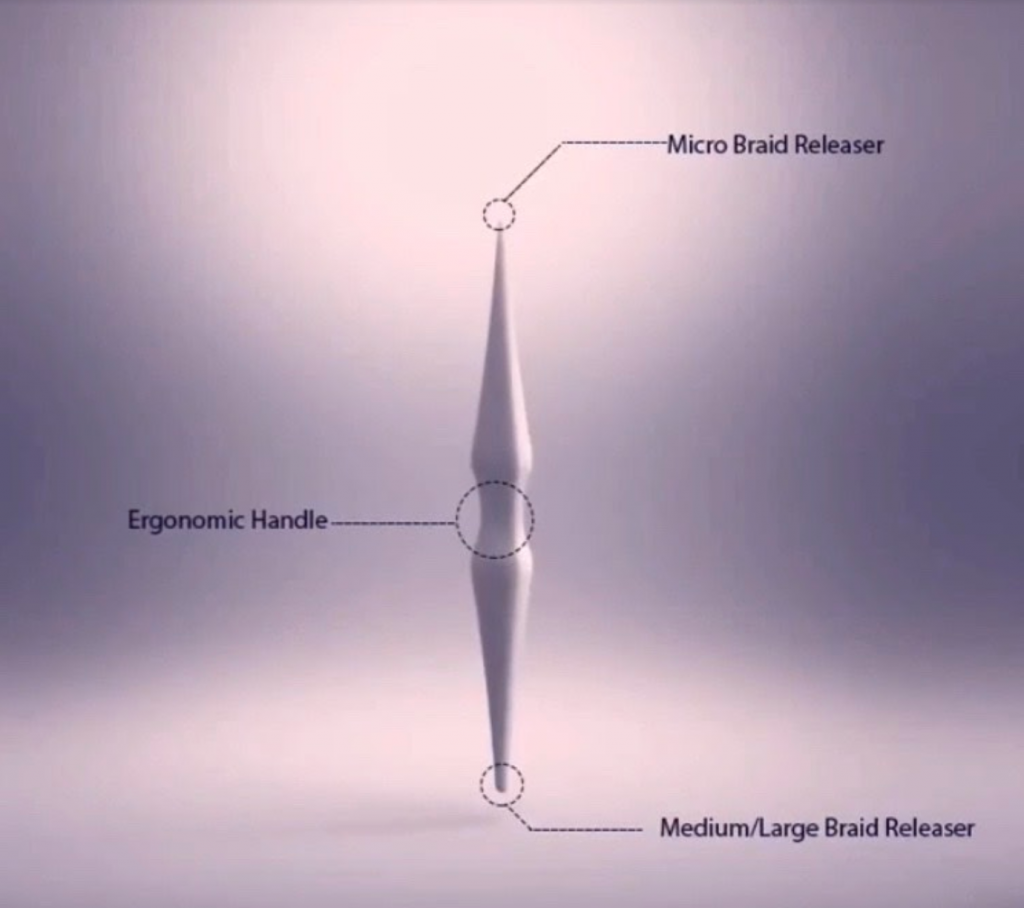 Inspired by the original her mother created, the second generation Braid Releaser is a spear shaped curved tool with an end for mini braids and the other for thicker braids.
